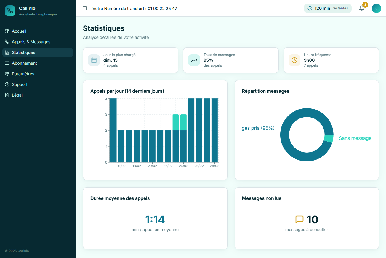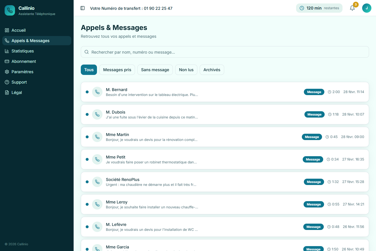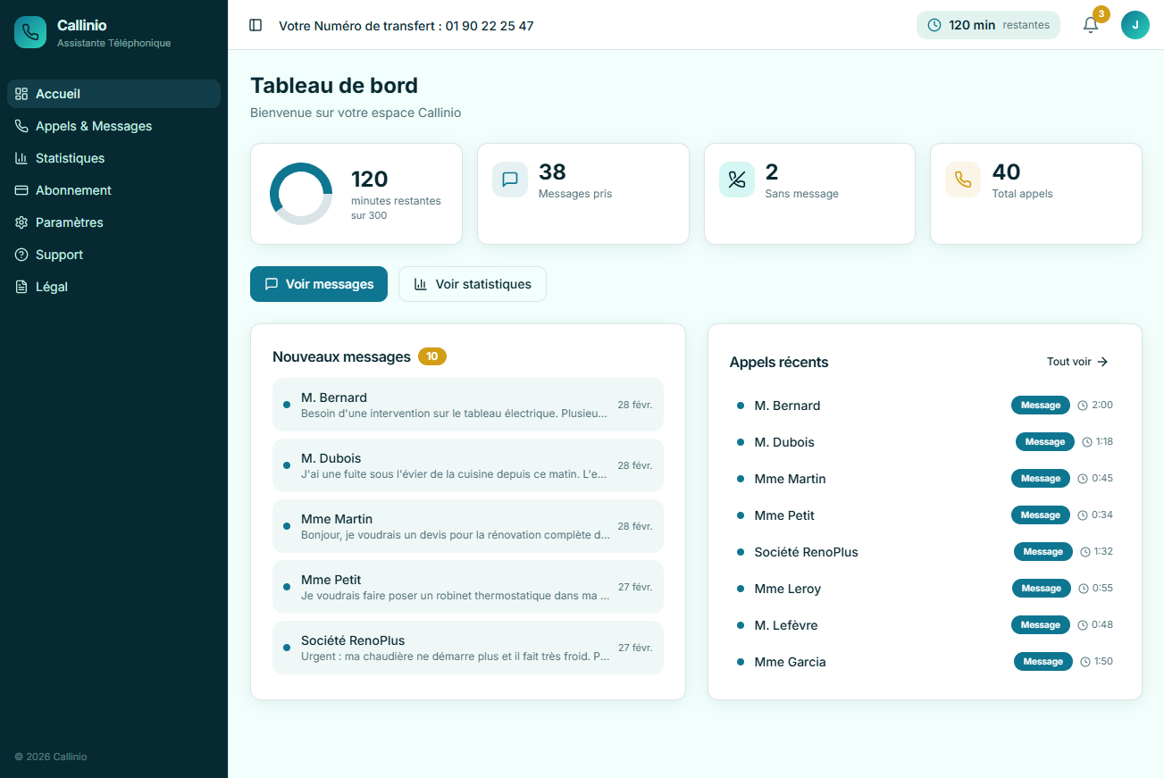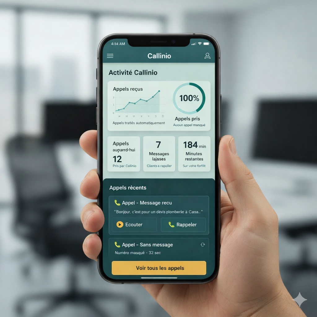 Callinio prend vos messages, collecte les coordonnées et vous transmet tout instantanément. Vos clients sont accueillis, même quand vous êtes sur le terrain.