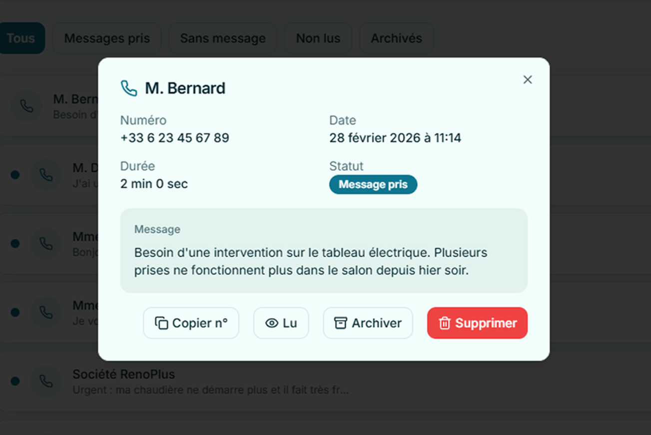 Pas un robot froid. Pas une messagerie vocale. Une assistante professionnelle qui accueille vos clients, prend leur message et vous l’envoie instantanément.